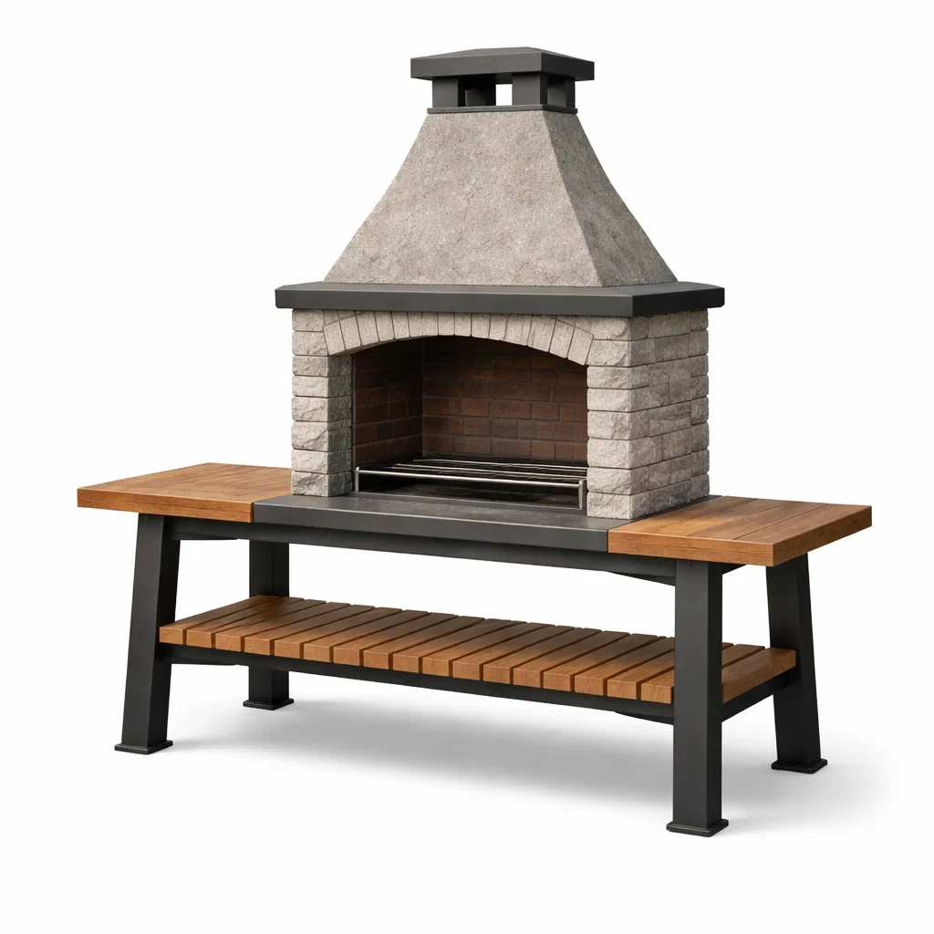 Barbecue en pierre reconstituée avec deux plans de travail en bois dur et structure en acier inoxydable.