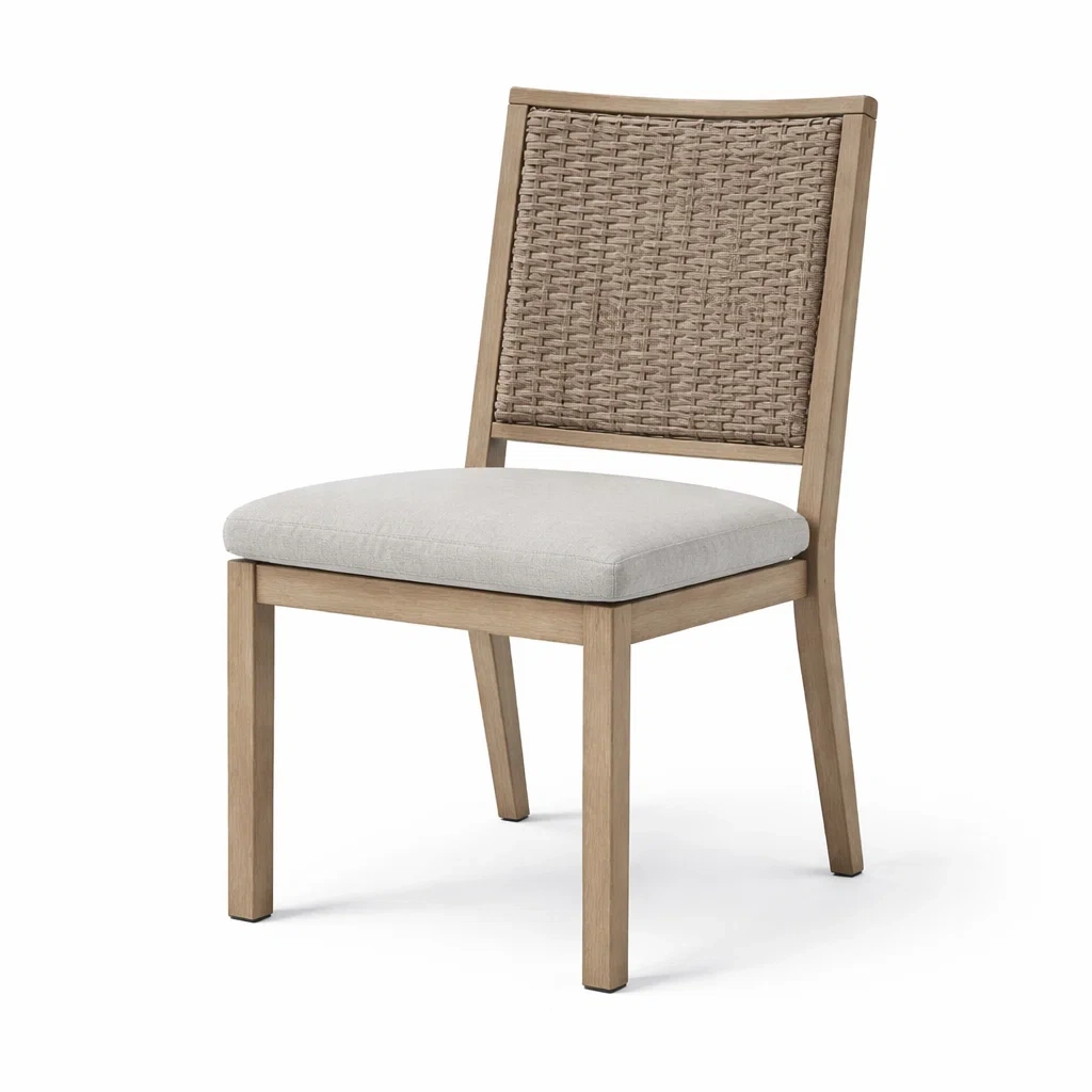 Cette chaise se compose d'un cadre en bois avec un dossier en rotin tressé.