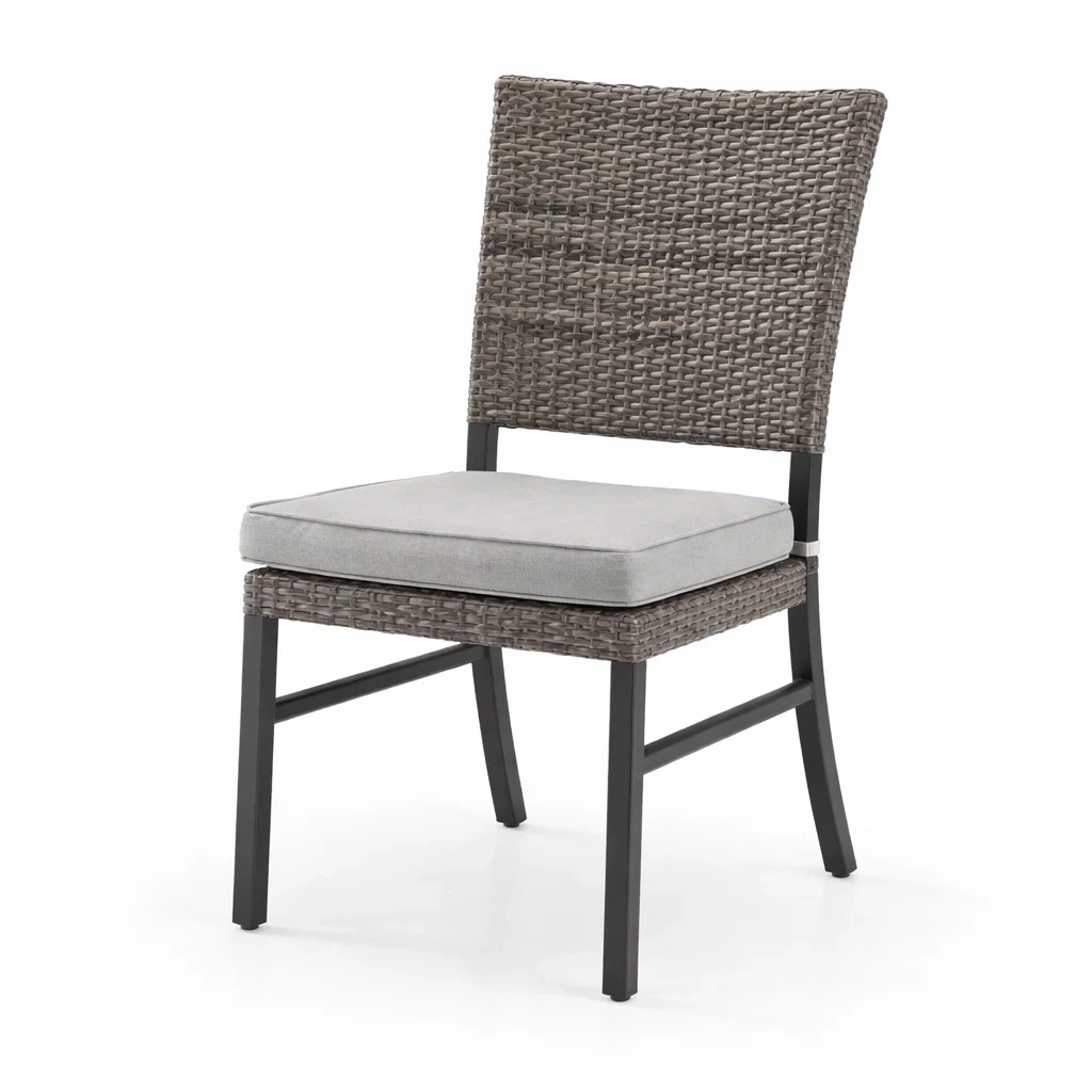 Cette chaise d'extérieur est conçue en résine tressée de couleur brun gris et possède un coussin d'assise en polyester gris clair. La structure est faite en aluminium revêtu de poudre, assurant une résistance aux intempéries. Dimensions : hauteur 85 cm, largeur 55 cm, profondeur 60 cm. Poids : 6.50 kg.