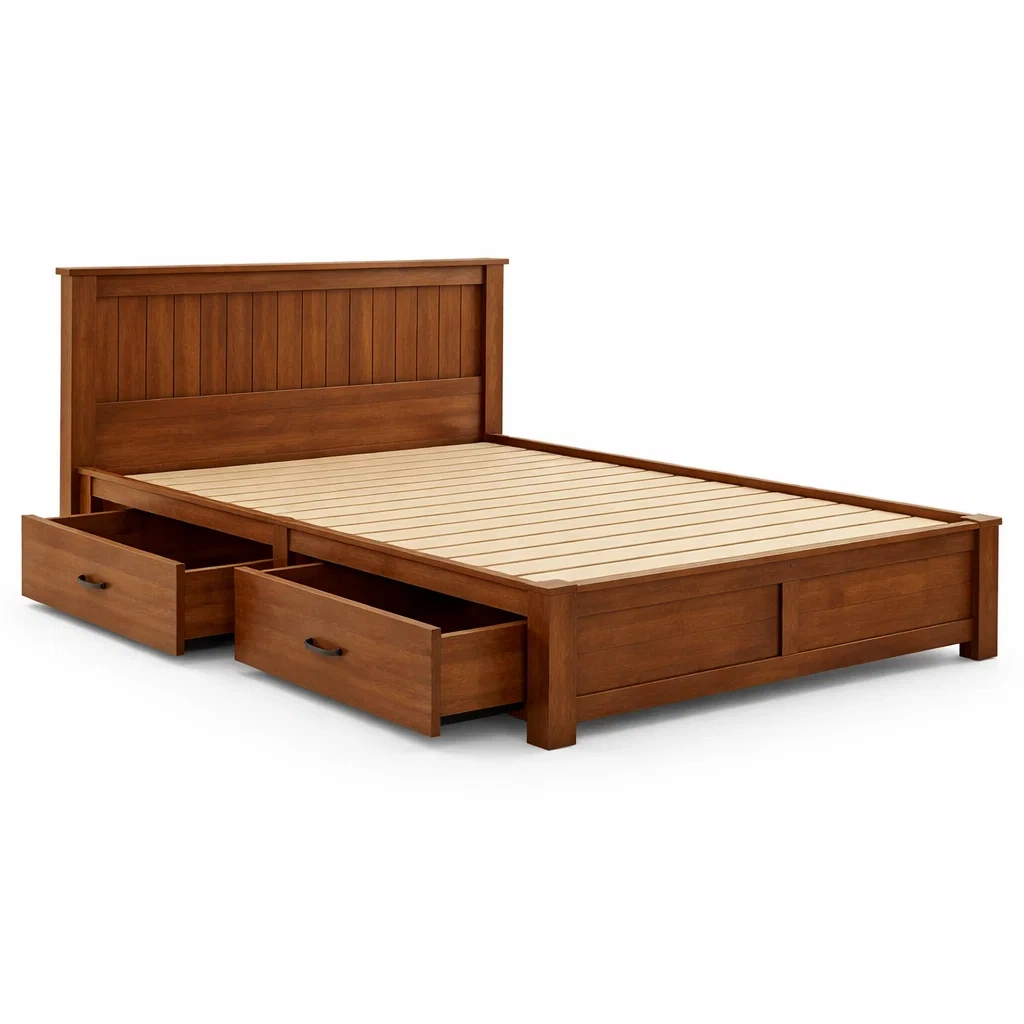 Ce lit double est construit en bois d'hévéa avec une finition en chêne foncé. Il est équipé de sommiers à lattes en bois pour un soutien robuste. Deux tiroirs de rangement intégrés offrent un espace de stockage pratique.