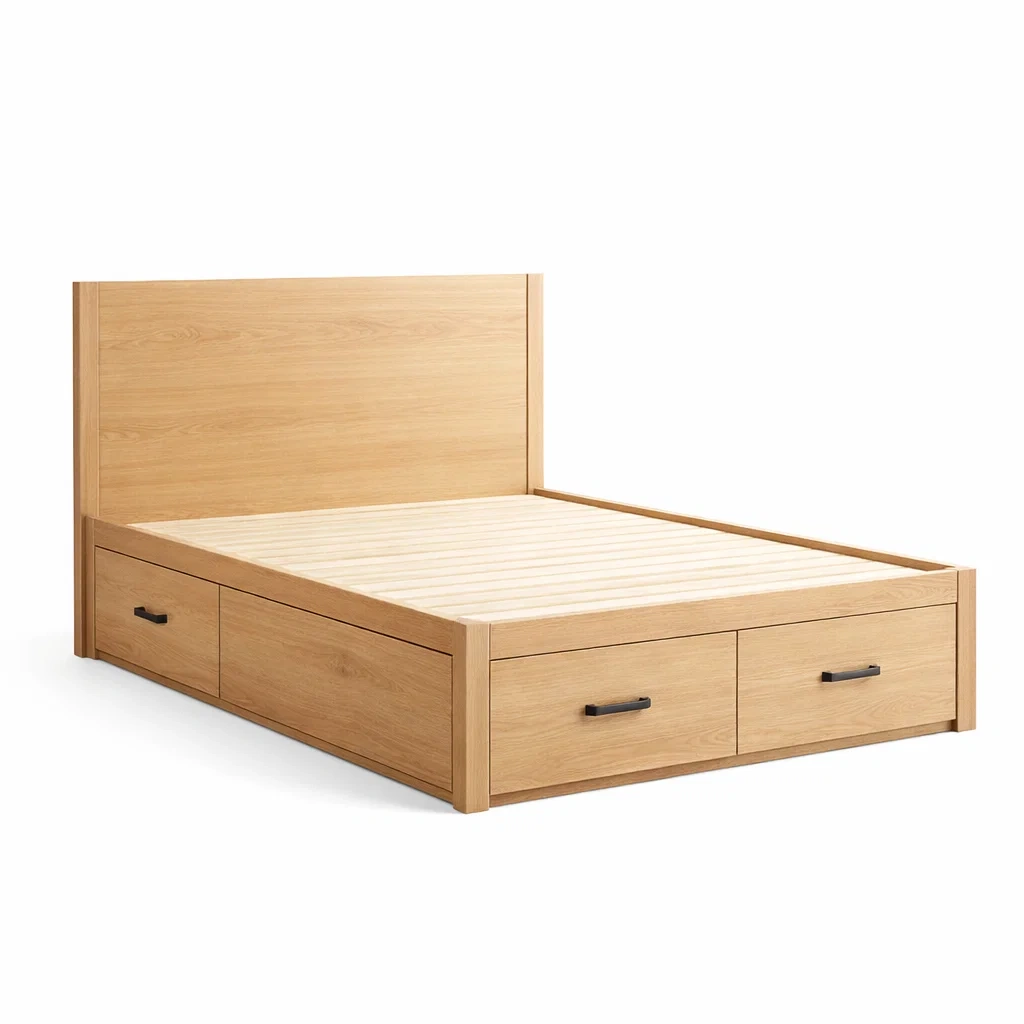 Ce lit double est fabriqué en bois de chêne avec un placage stratifié, doté de tiroirs intégrés pour un rangement pratique. Les dimensions du lit sont de 200 cm de longueur, 140 cm de largeur et 100 cm de hauteur.