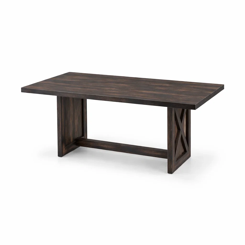 Table en bois de chêne avec finition marron foncé. Dimensions : 180 cm x 90 cm x 75 cm.