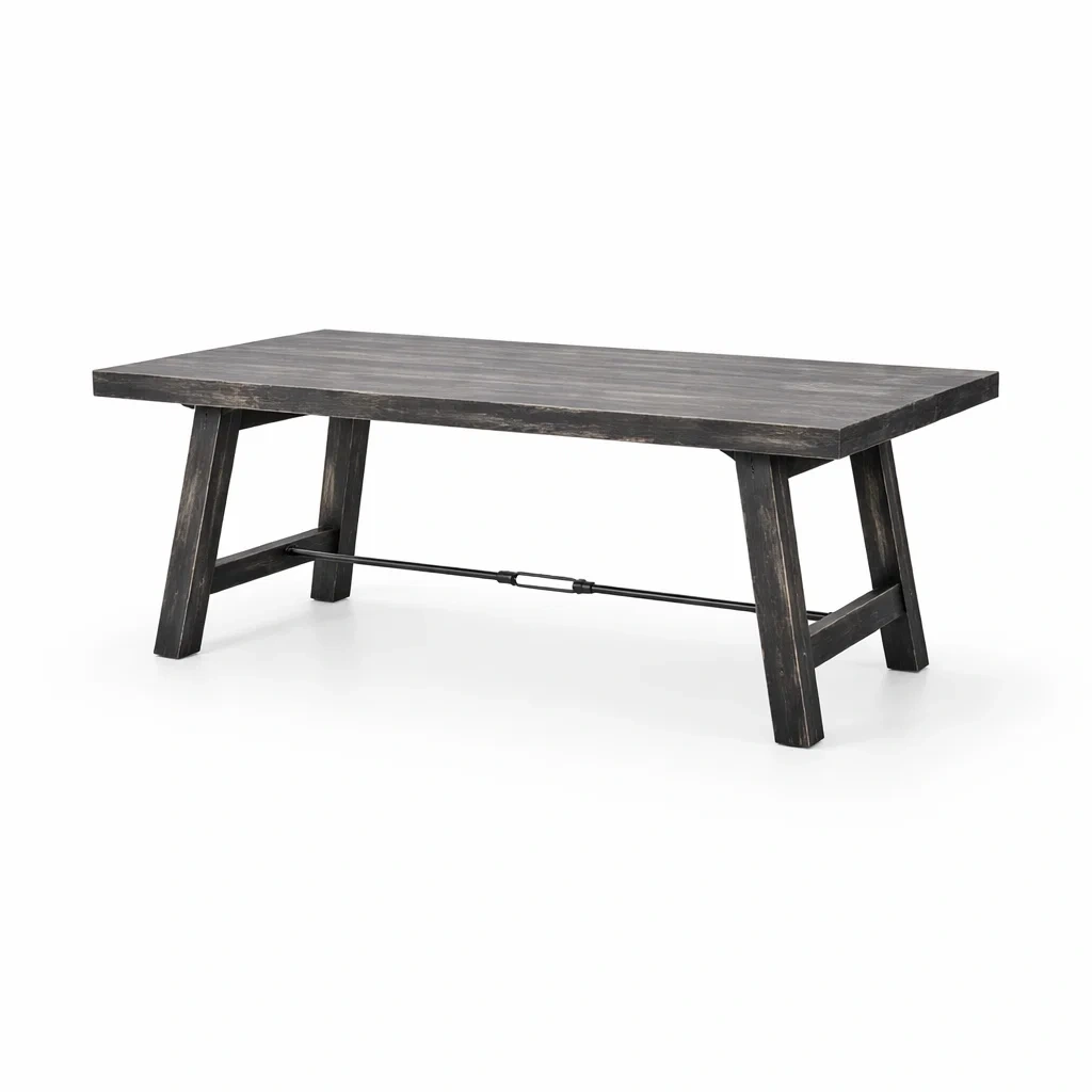 Cette table rectangulaire est fabriquée en bois massif avec une finition teintée. Les accessoires en métal renforcent sa structure. La table repose sur des pieds en forme de tréteaux avec une barre de renfort en métal.